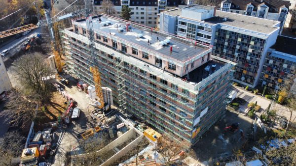 Besondere Herausforderung sind die aufwändigen Vorabmaßnahmen. Durch das Baufeld läuft die Entwässerung der Großküche sowie die Abwasserleitungen des Zwischenbaus. Mit hohem Aufwand muss der Fettabscheider inkl. Hebeanlage vorab neu gebaut werden, die Leitungen im Bestand unter der Bodenplatte neu verlegt werden. So kann die Stillstandszeit der Küche auf ein Minimum reduziert werden.