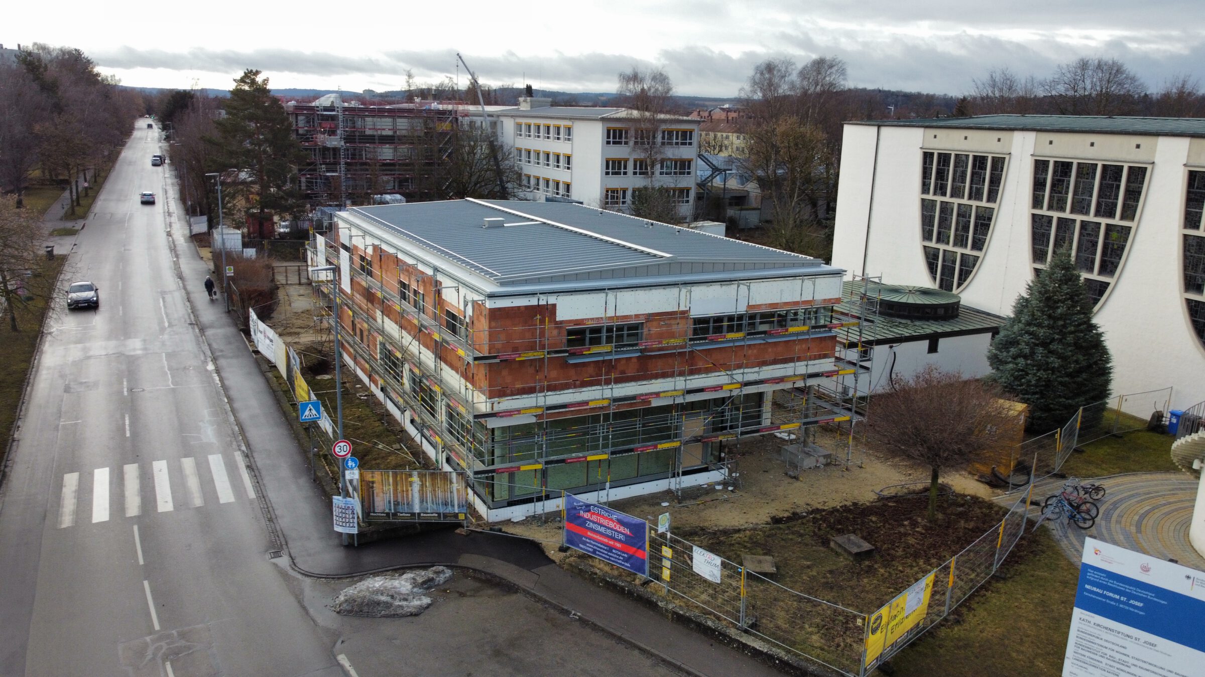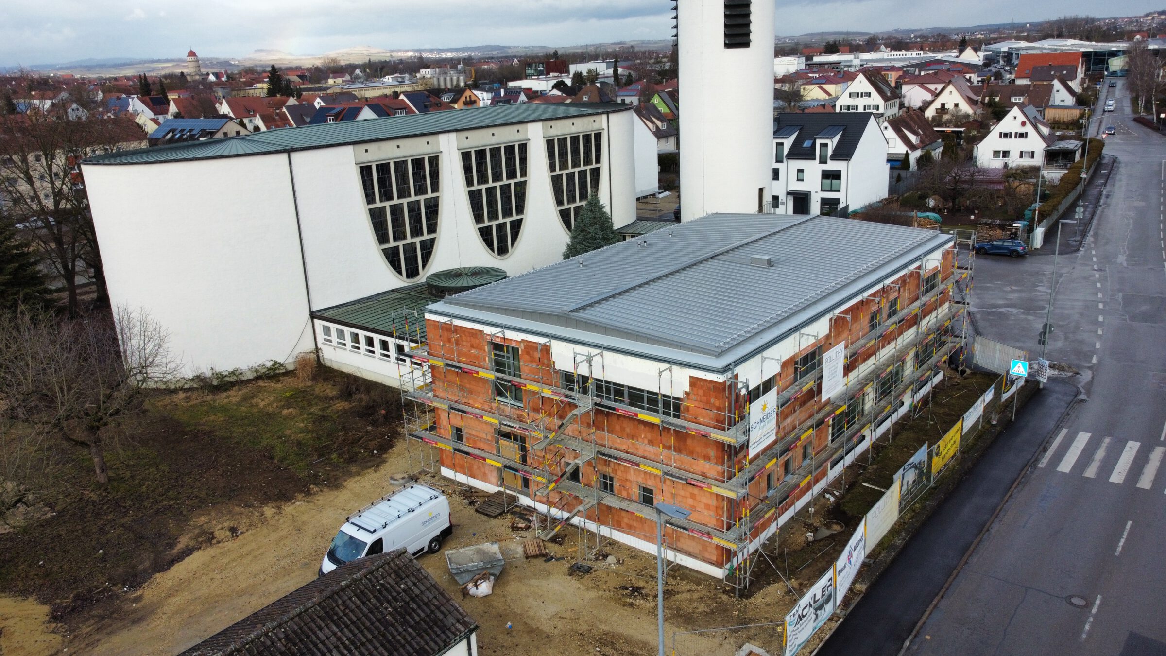 Im Wemdinger Viertel in Nördlingen wurde das alte Pfarrhaus abgerissen. An dessen Stelle entsteht das neue Gemeindezentrum mit Gemeindesaal und Räumlichkeiten für die Pfarrei. Besondere Herausforderung ist die Versorgung der bestehenden Sakristei, die auch während der Bauphase sichergestellt werden muss.